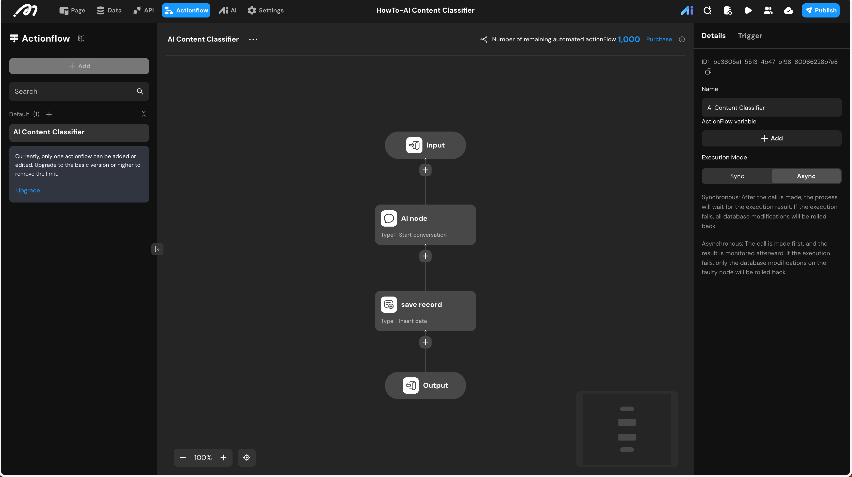 Run Actionflow->AI Content Classifier. - Data Binding: Bind the