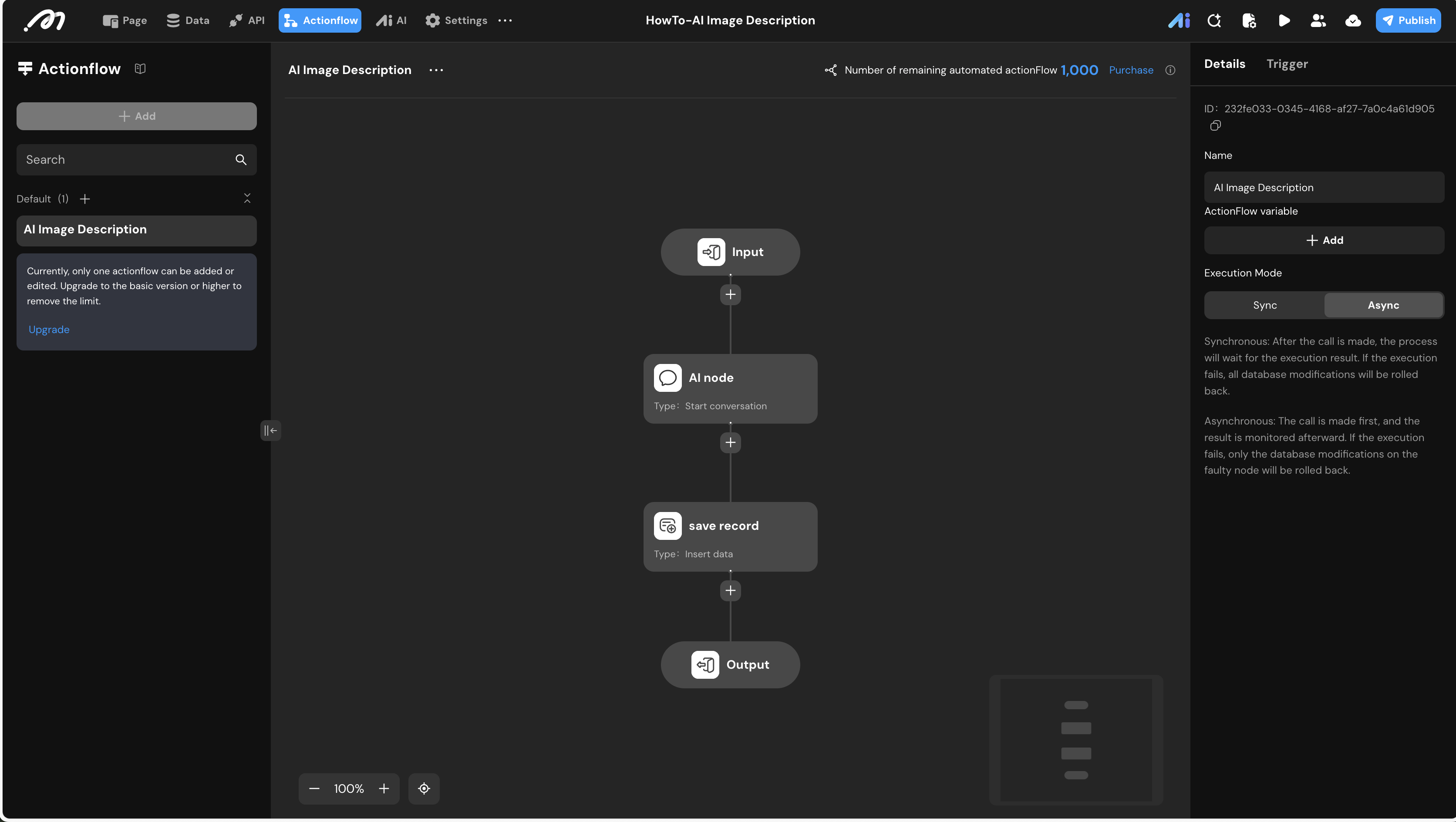 The Actionflow handles the logic of passing the image to the AI and saving the result. Set the Execution Mode to Async (Asynchronous) in the right panel.