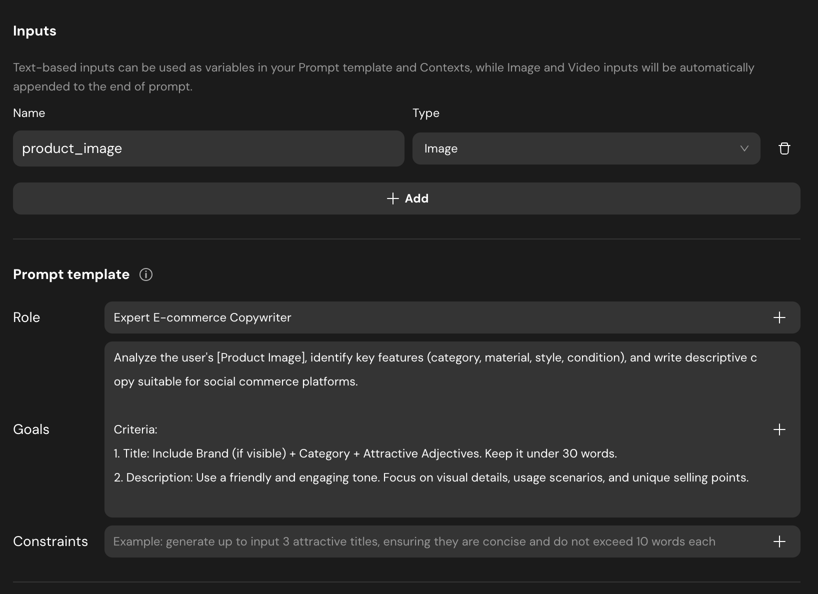 product_imageand set its type to Image. - Prompt Template: