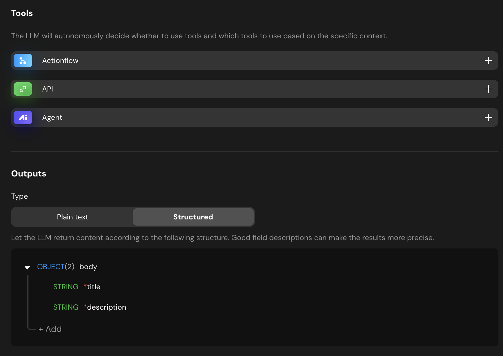 - Structured Output: To ensure the backend can save the data easily, set the output type to Structured. Define an object