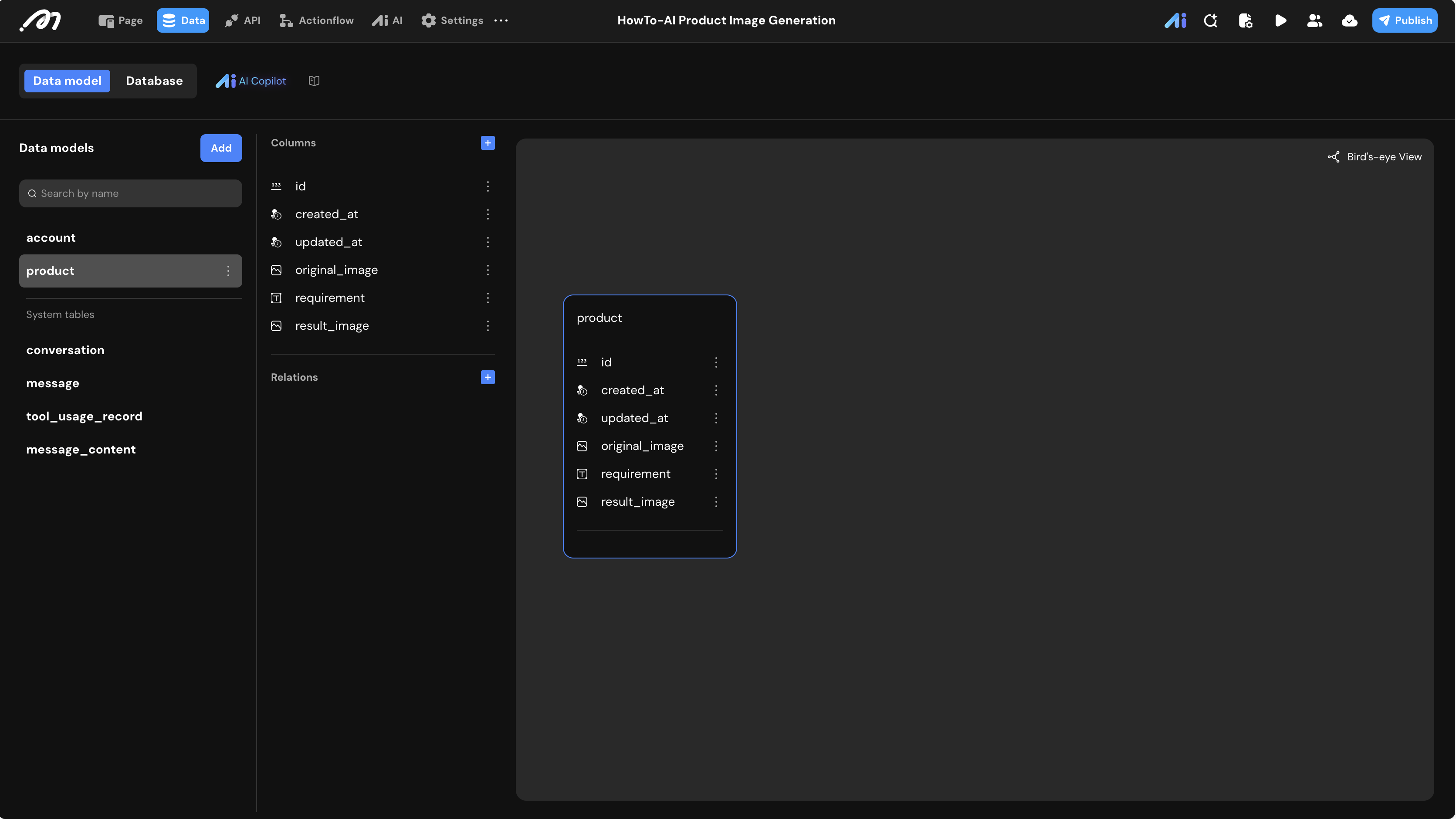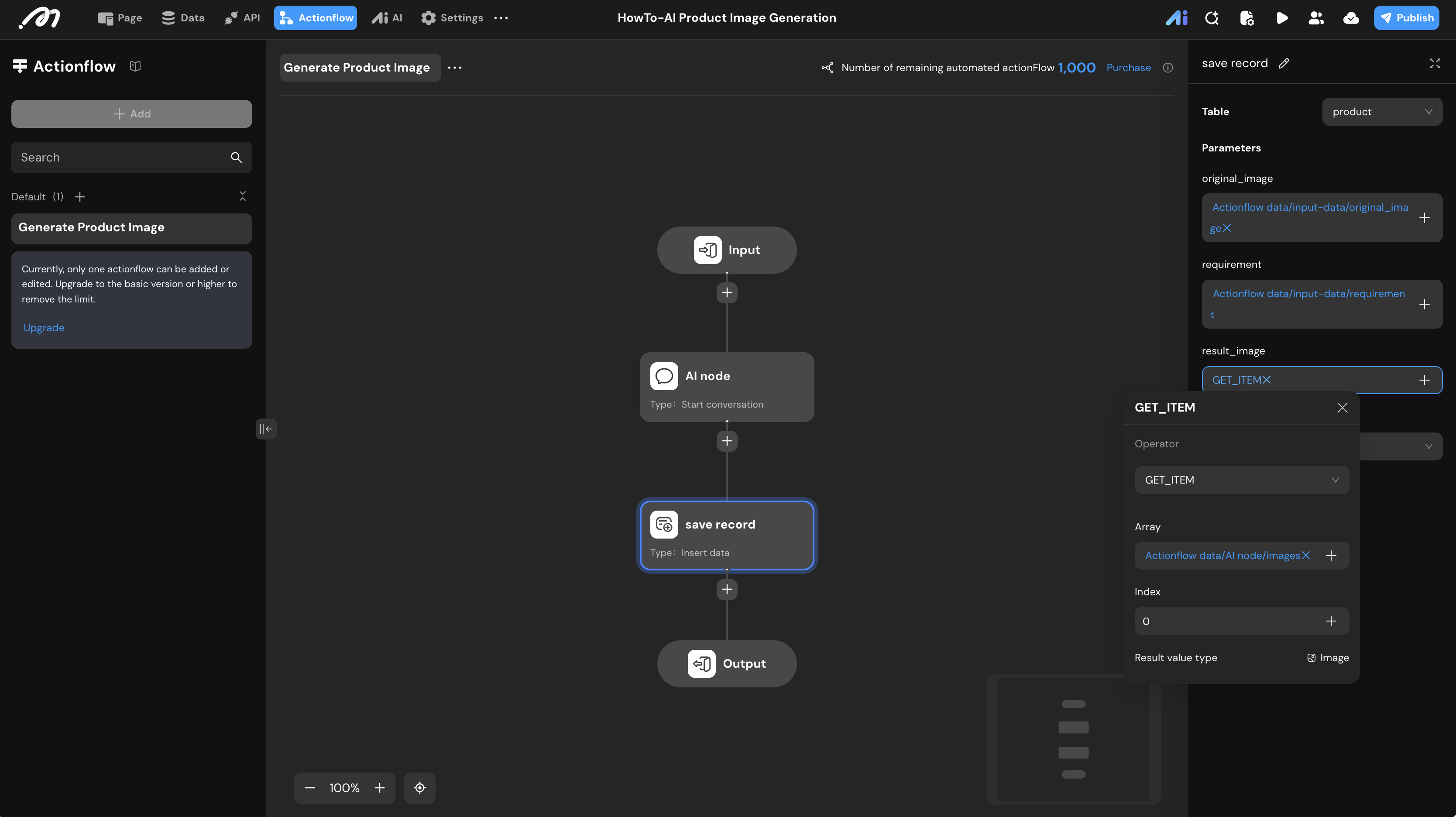product. original_image&requirement: Bind from the Actionflow inputs.result_image: Use theGET_ITEMformula to extract the image from the AI output array (usually index0).
