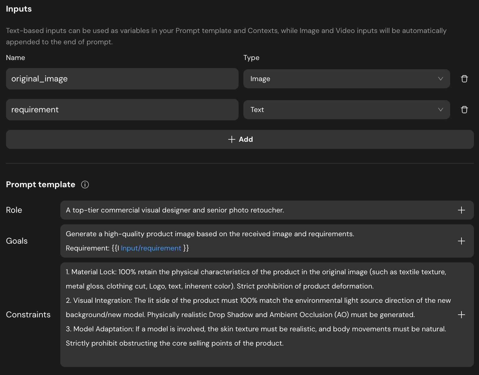 \{{Input/requirement\}}to reference user input. - Constraints: Include instructions for “Material Lock” (to keep the product consistent), “Visual Integration” (lighting matching), and “Model Adaptation.”