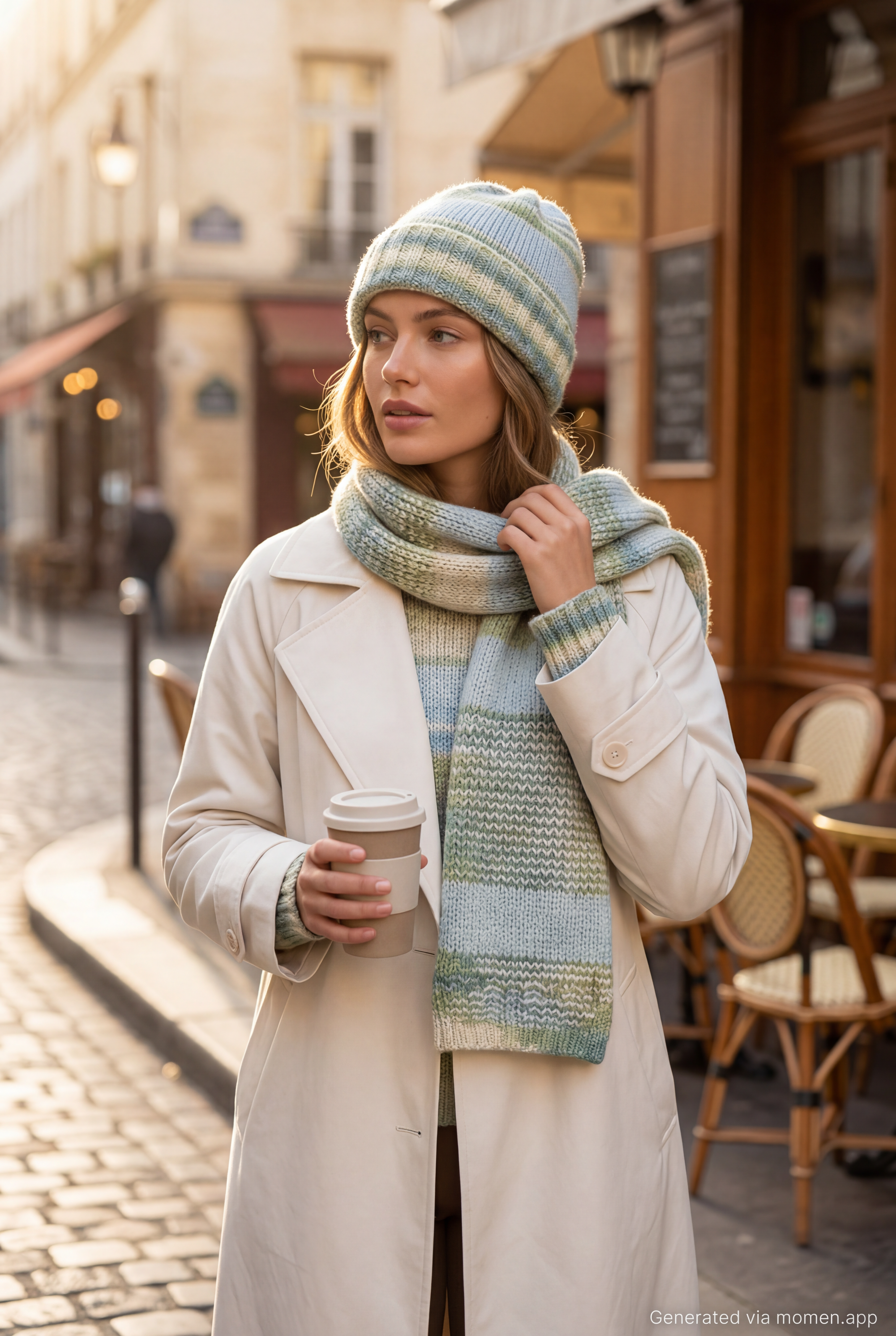 * Scene & Lighting: Background is a classic European street corner or a chic New York cafe exterior. Soft morning sunlight (golden hour lighting) creating beautiful rim light on the scarf.