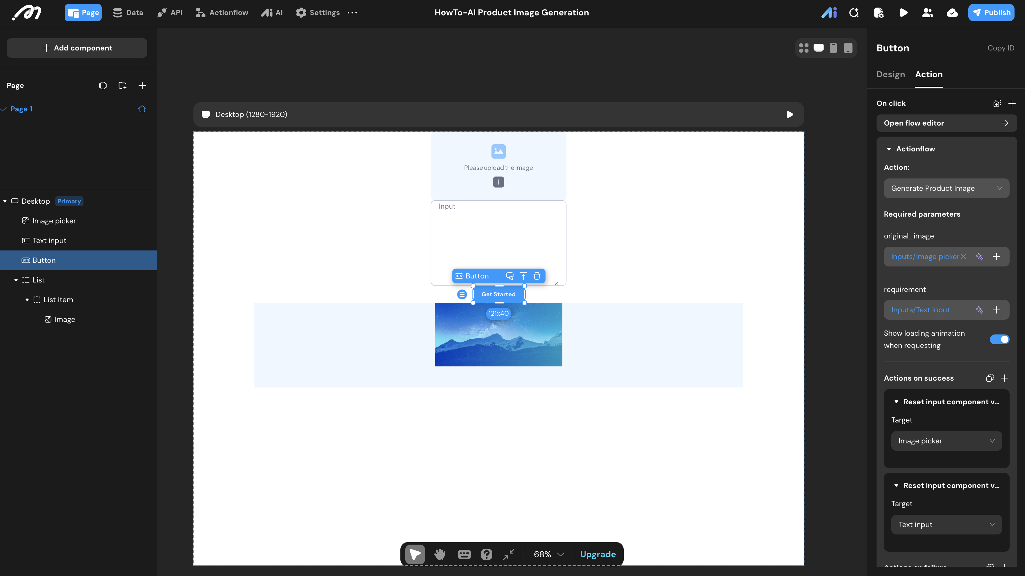Generate Product Image. Bind the components’ values to the flow parameters. - Actions on Success: Add two “Reset input component value” actions to clear the Image Picker and Text Input.