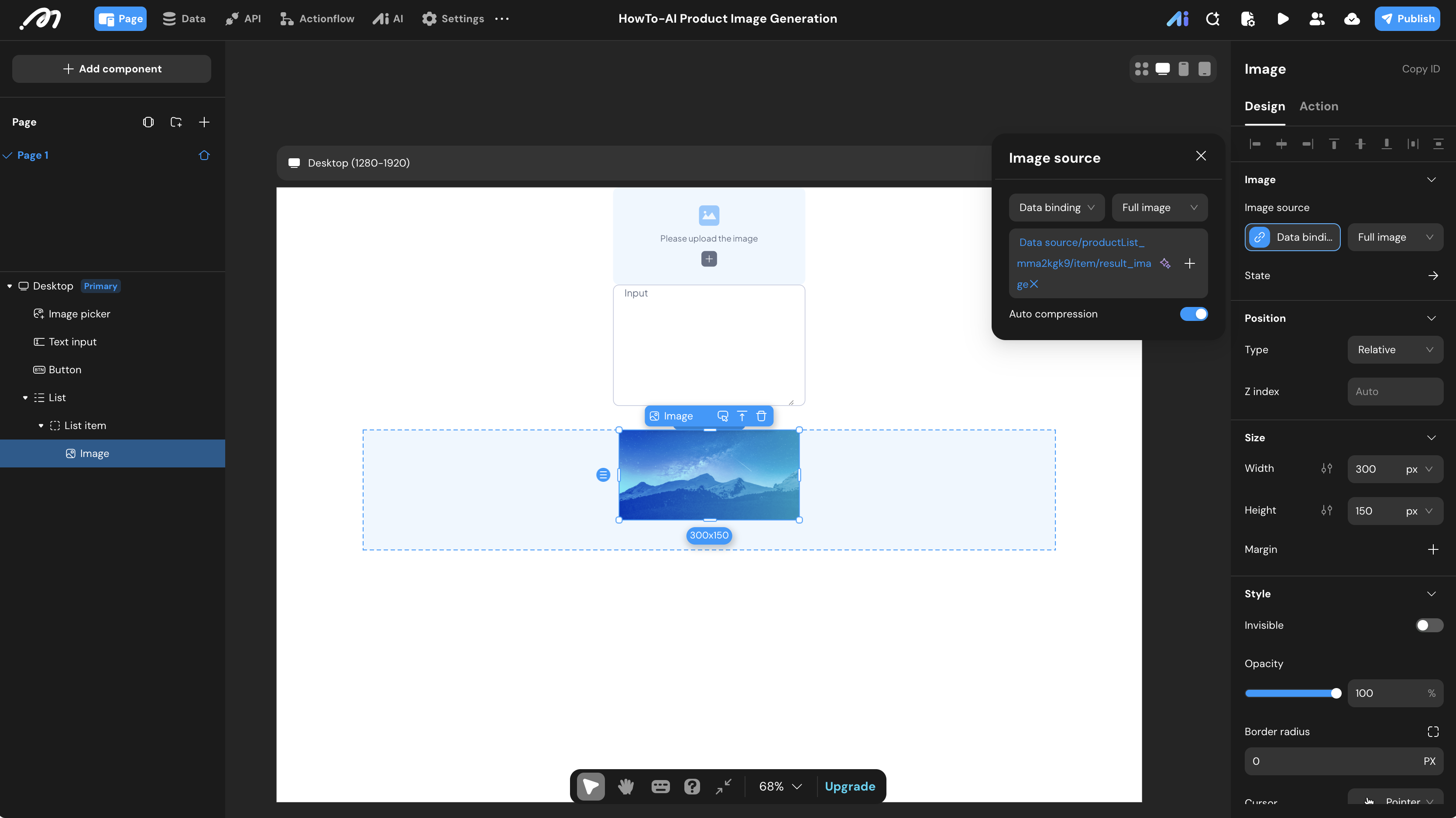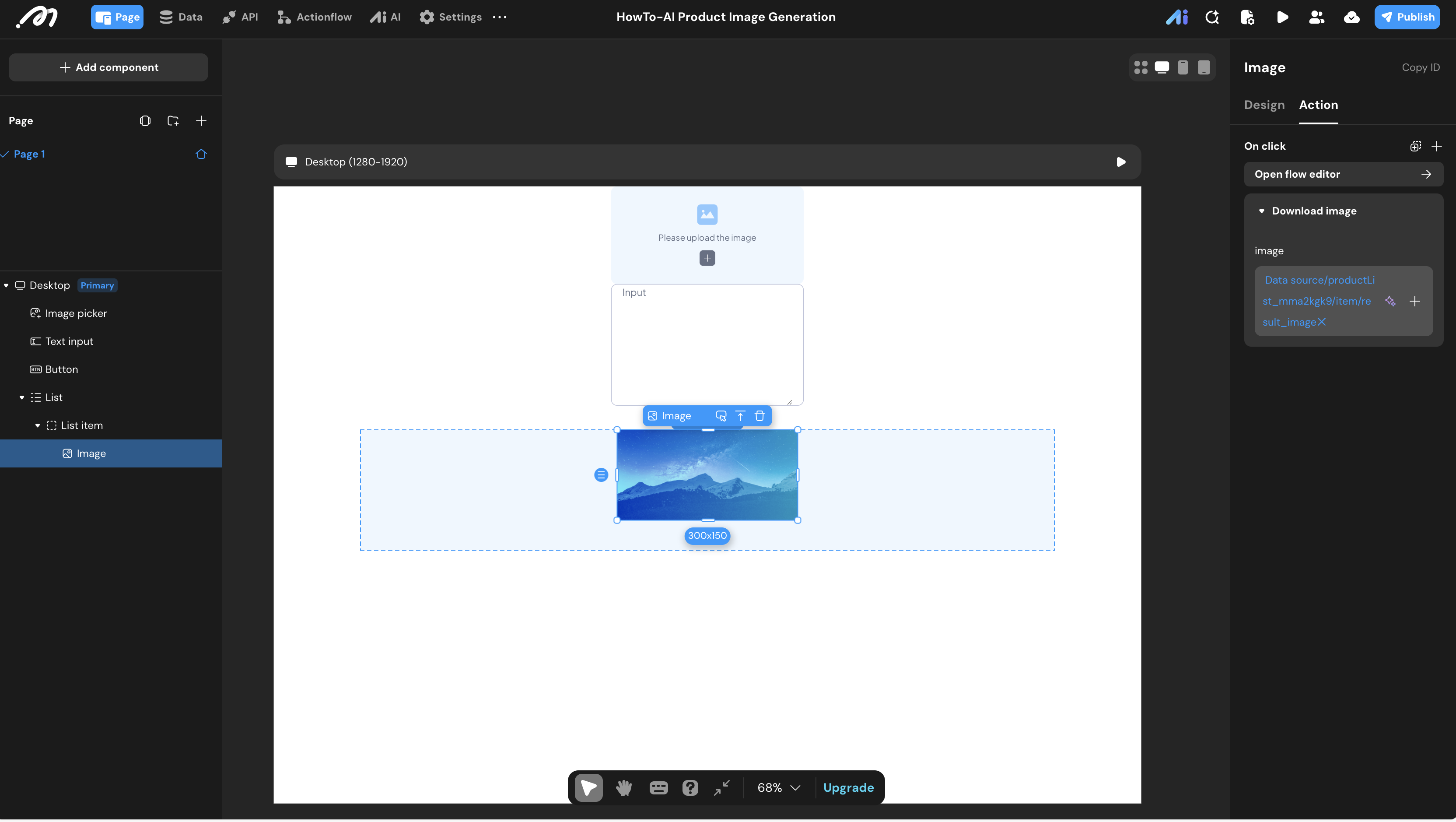 item.result_image. - Click Interaction: Add a “Download Image” action, binding the source to the same
