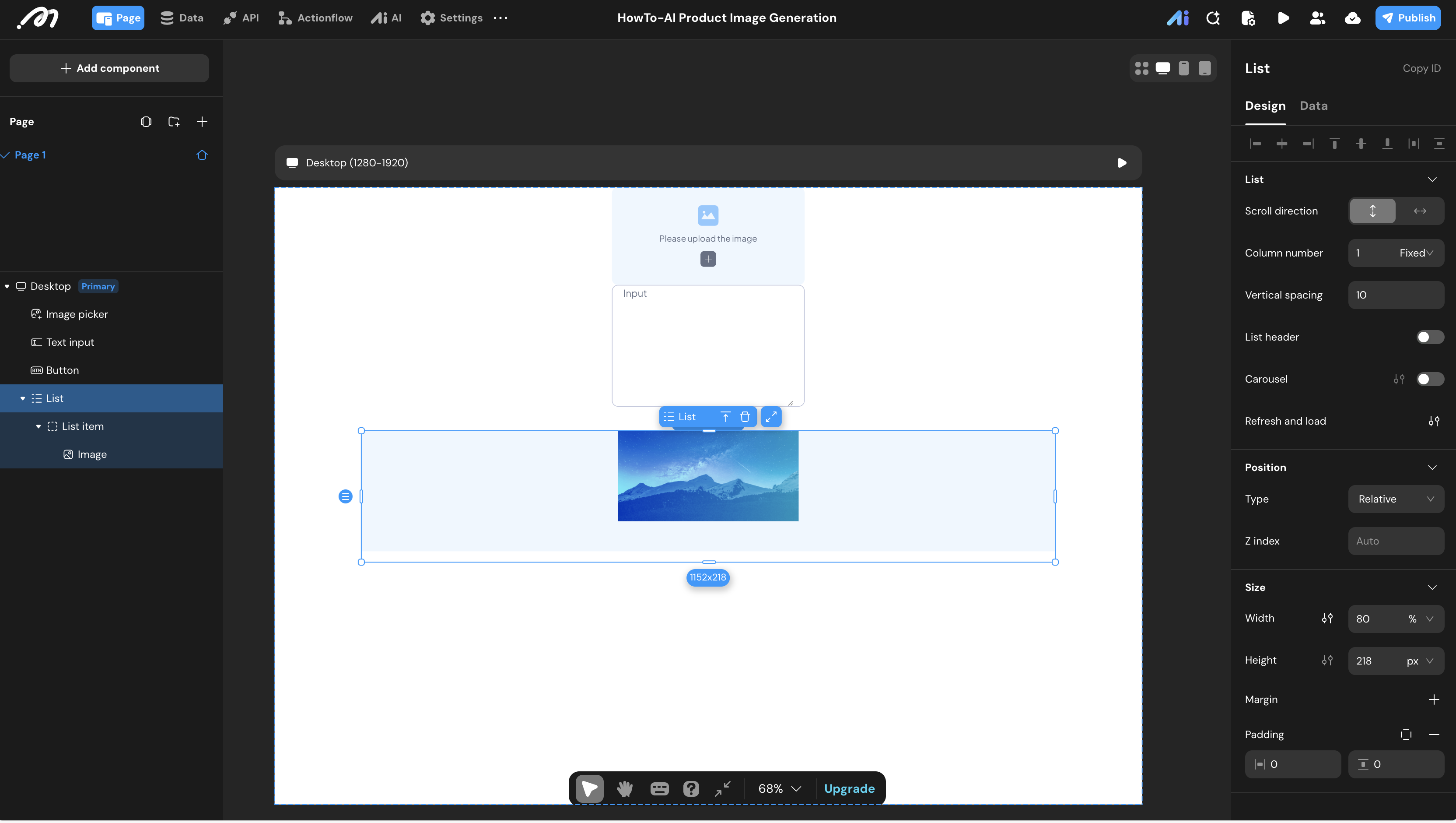 - Inside the List, add an Image component. Bind its source to