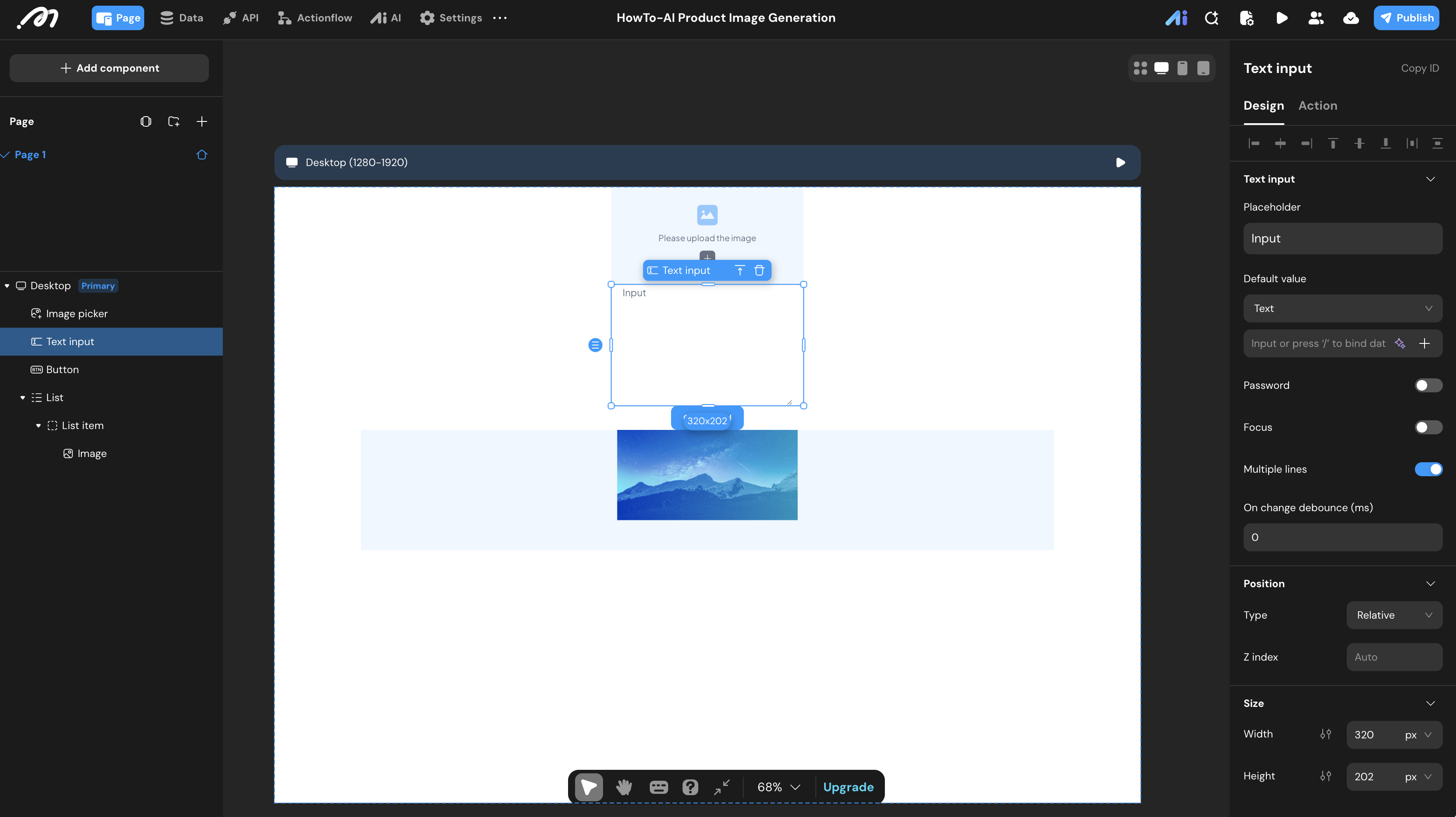 - Inputs: Drag an Image Picker for the product photo and a Text Input for requirements. Enable “Multiple lines” for the text input.